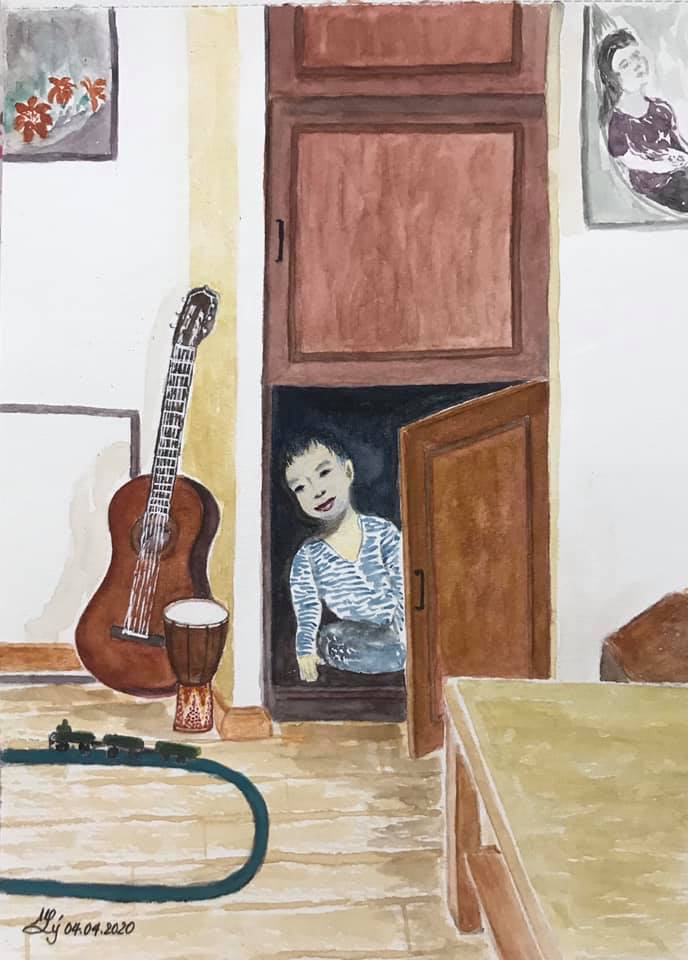 Đó là cái cớ khiến tôi vẽ bức tranh cháu ngồi trong tủ để nhắc nhở chính mình rằng hãy xoá bớt những hiển thị nội tại xấu trong mình đi, hãy lấy lại trí tưởng tượng tươi mới như những đứa trẻ, hãy hướng tâm trí của mình vào việc tưởng tượng chi tiết về Khu nhà Homestay mơ ước của mình ở Bắc Ninh hay ở Bờ biển Đà Nẵng, nơi mà mình có thể an hưởng tuổi vàng bên các bạn già một cách vui vẻ.